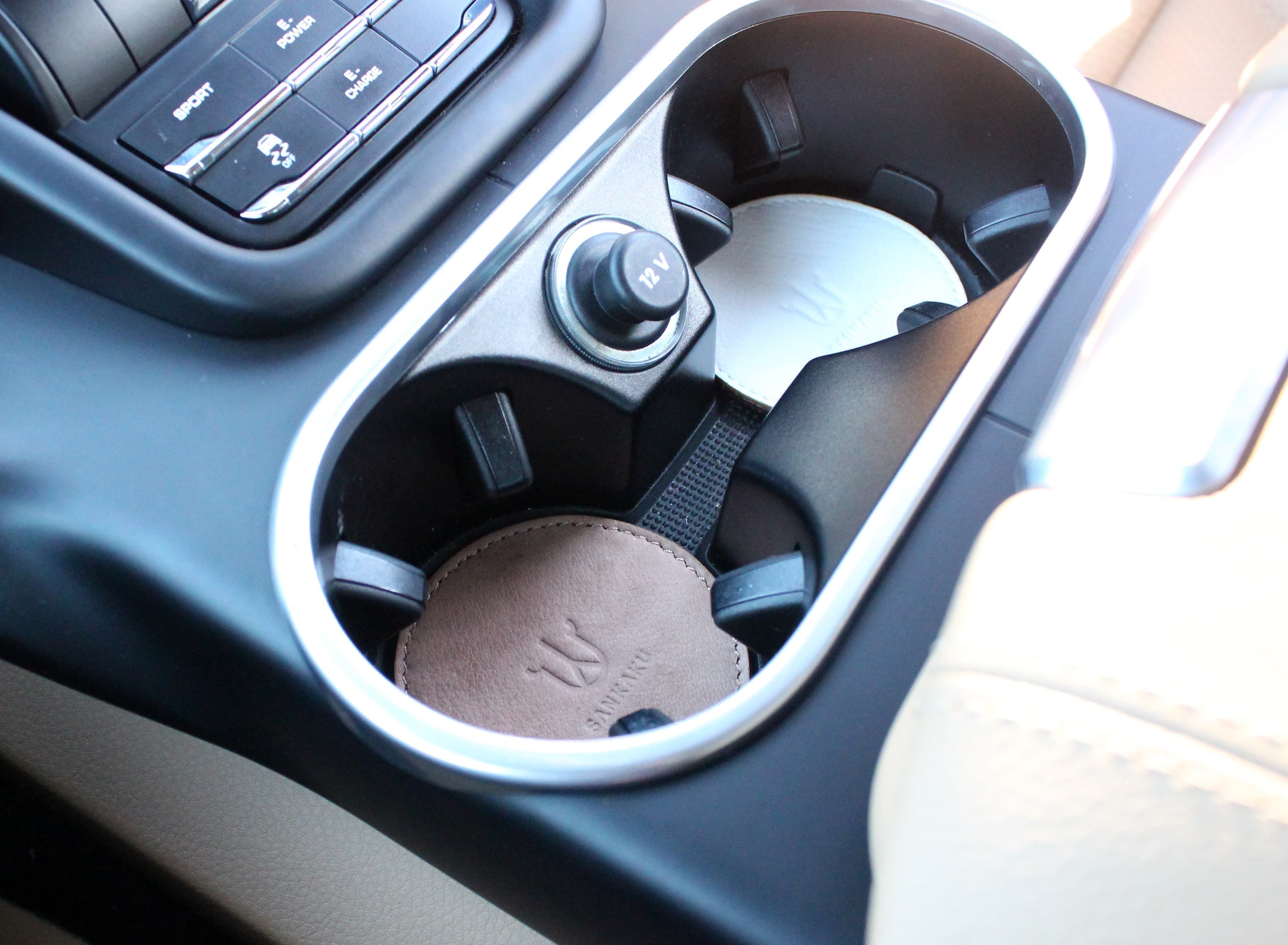 キョン革の吸水速乾性と、肉厚のクッション性を生かした車用のコースター(2枚セット)。